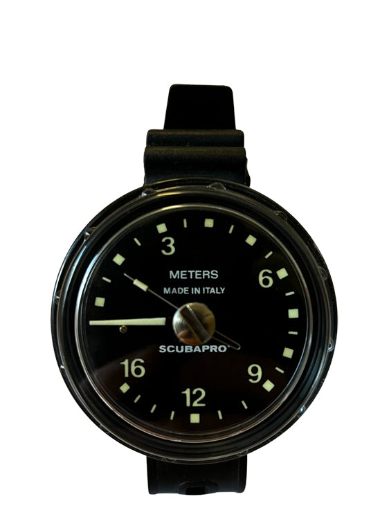 The Scubapro PD16 Military Analogue Depth Gauge is an analogue depth gauge with wrist band in soft thermoplastic in an ABS 64mm case with parabolic scale and maximum depth needle.