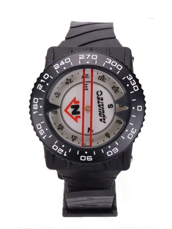 Accurate and robust compass designed specifically for underwater navigation. The Aquatec compass has a large tilt potential of +- 25 degrees, a minimalistic face and easy-to-read numerals, and a ridged bezel for high functionality in any diving scenario. Its large side window provides another clear reading angle. The compass itself is protected within a scratch-resistant and durable, oil-filled polycarbonate case. To complete it's multifaceted role in underwater navigation, it has a luminescent face for exploring dive sites in low light environments. Lastly, the compass is compact and wrist-mounted with rubber strap, perfect for on-the-go dive travel.