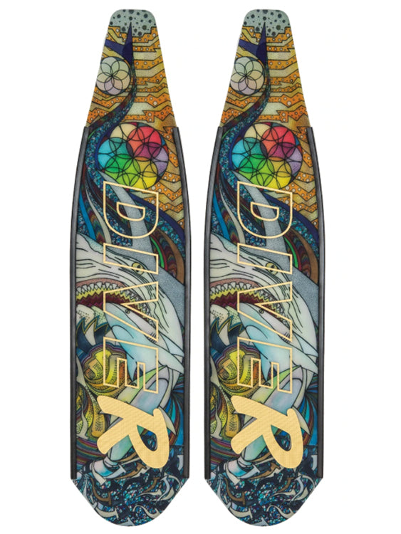 DiveR Freediving Fin Blades are crafted by hand for precision with a stunning design. The Shark design features some of our favourite underwater predators as well as a visually stunning colourful design. Be the envy of all of your diving buddies with this simple beautiful fin.