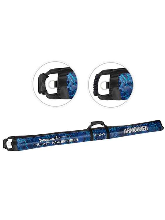 The Armoured Speargun bag is made from durable PVC and reinforced with polyester, the dual handles in tough nylon webbing with a comfortable rubber grip helps you to comfortably carrying it through the airport, up the road or down the beach.