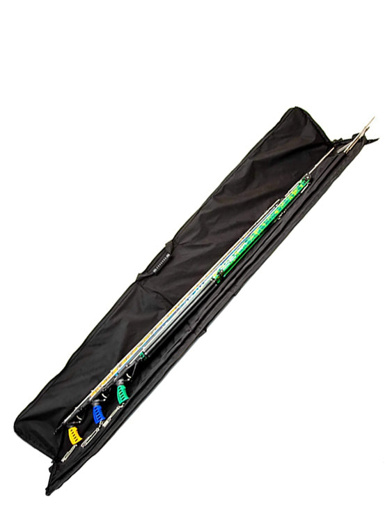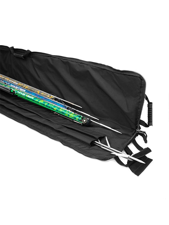 It comes in two different sizes: Large which can hold up to three spearguns or Small with the capacity of two spearguns. Both sizes can hold wetsuits, spears in the two integrated and protected spear pouches and a foldable float so you'll be blown away by the amount of gear this bag can hold and protect.