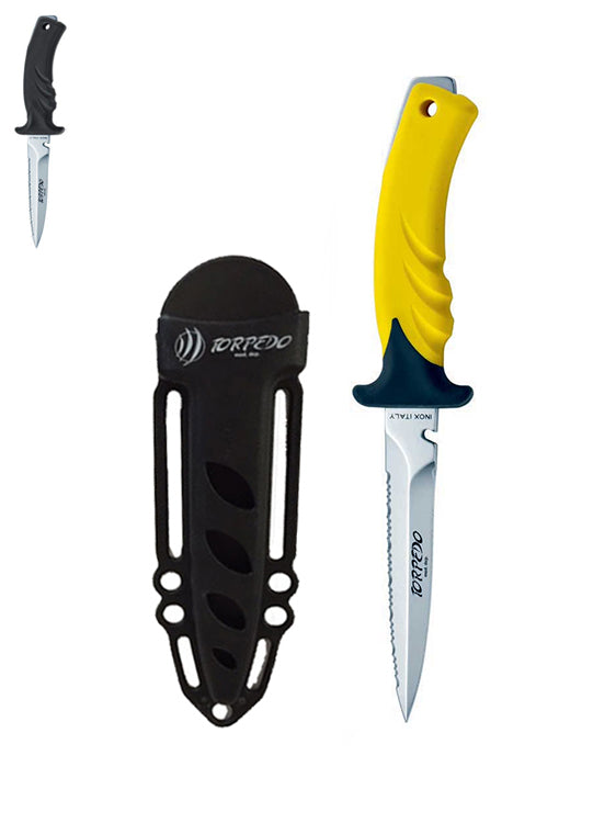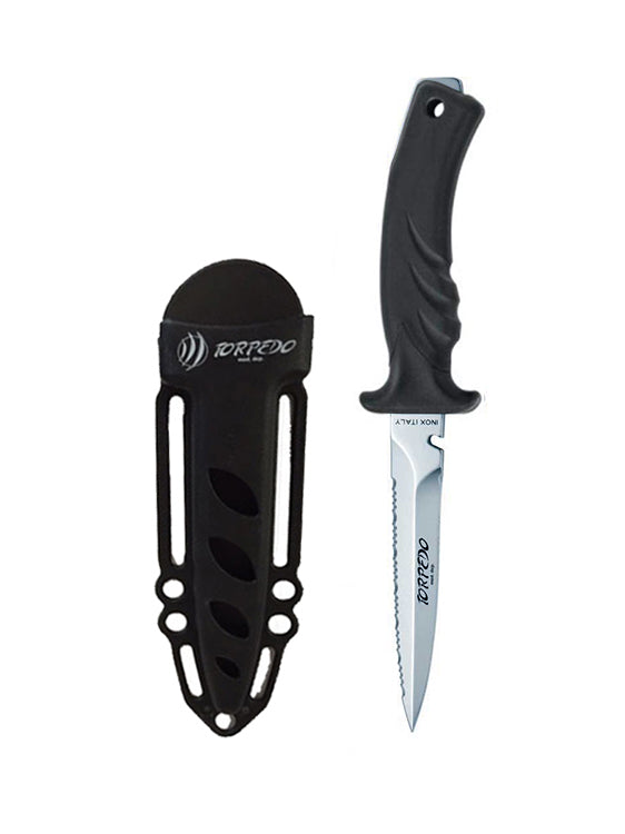This is the Mac Coltellerie Torpedo 11 Knife. It is your perfect companion for spearfishing adventures. The Stainless Steel blade is durable and corrosion resistant. The spearfishing knife features two edges: one straight edge for making clean cuts and one serrated edge to saw through ropes. Also integrated is a line cutter and point-tip.