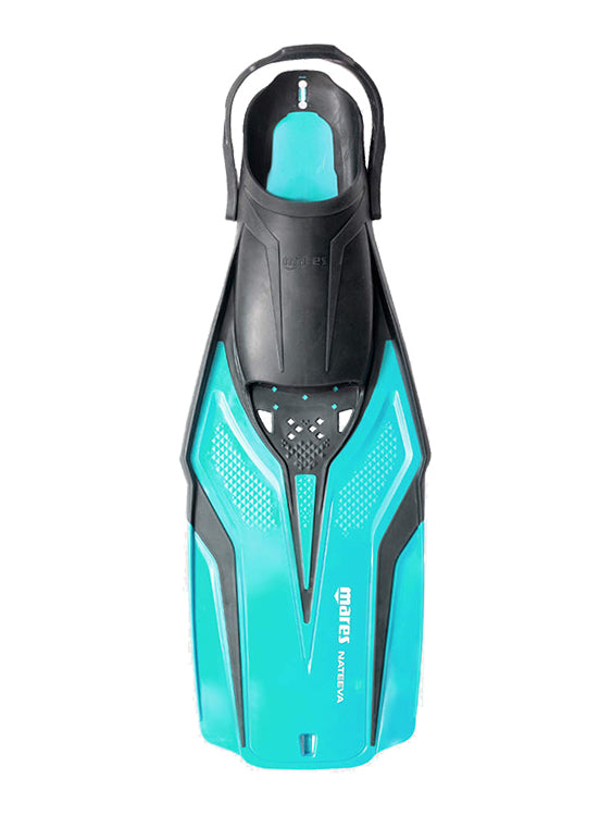 The Mares Nateeva Snorkelling Fins come in various sizes, from XS to L-XL, and in three different colours: Aqua, Blue and White, to match any colour taste and feet size out there!