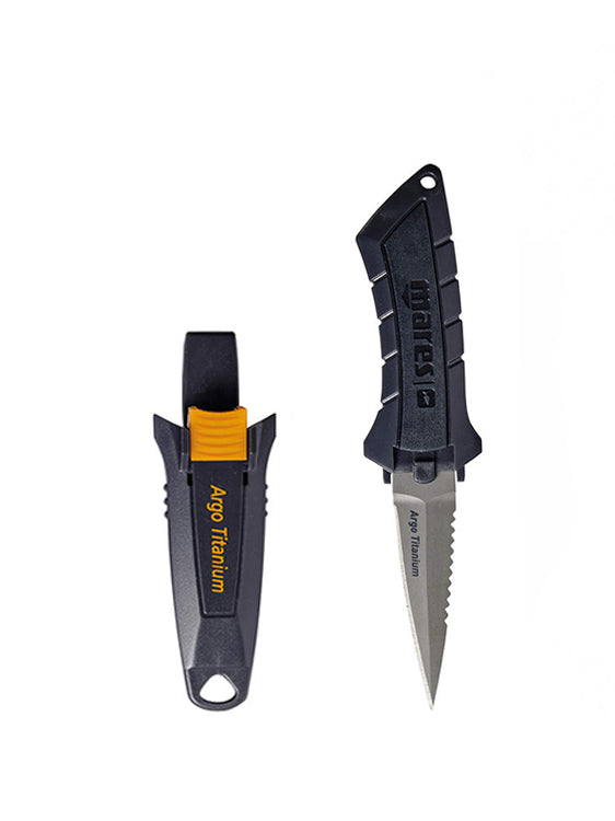 The Mares Argo Titanium Knife is a 72mm long, 3mm blade with a practical cutting edge to provide both cutting and sawing. With elastic and Velcro straps the blade can be worn both on the calf or the arm for easy access when diving.