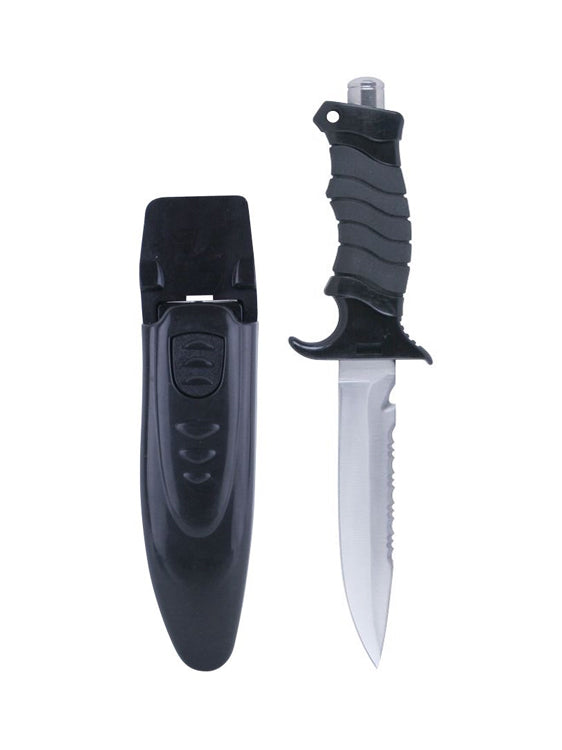 The Ocean Pro Komodo Knife is a stainless steel 14cm blade with serrated edge and line cutter. Its ergonomic grip feels comfortable in your hand, making this knife easy to use.