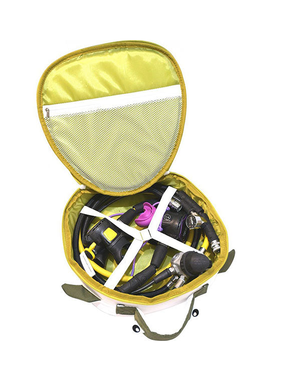 Inside you will find 3 pockets: an internal main pocket and a mesh zippered pocket in addition to the external zippered pocket, to meet all your needs. The main pocket features double smooth two-ways zippers and double internal security straps, to stop your regulators and hoses from shifting inside the bag.