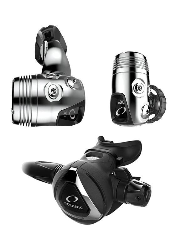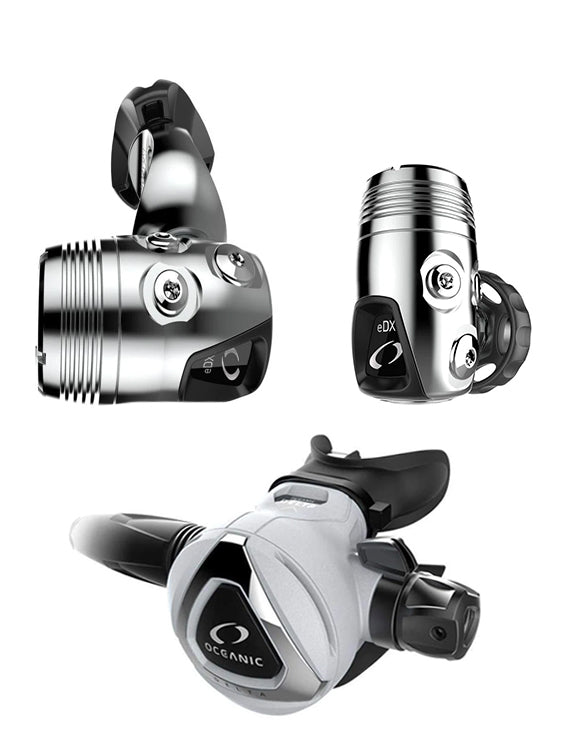 The Delta 5 is paired with Oceanic’s latest design, the cold-forged over-balanced diaphragm first stage, the EDX. Glide along and enjoy your dive; rest assured that this top-of-the-line combo has your breathing requirements covered.