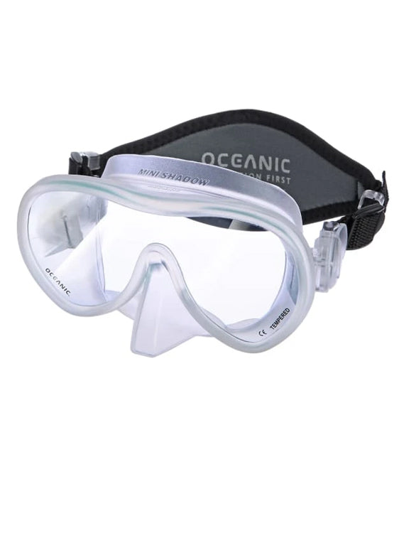 The Oceanic Mini Shadow Ice mask is a single-lens, low-volume dive mask with a clear skirt for an unmatched field of view! Oceanic’s Mini Shadow Mask features a sleek, 100% liquid silicone skirt that attaches directly to the tempered glass lens. The narrow silicon skirt fits perfectly on smaller faces.