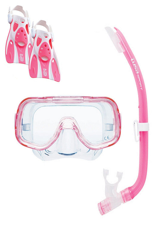 The TUSA Sport Mini Kleo Hyperdry Youth Travel Set (UP-2414) consists of a TUSA Sport Mini Kleio Youth Mask (UM-2000), which is ideal for kids faces aged 6-12 or small adult faces, combined with a TUSA Sport Youth Snorkel (USP-140) and the Multi-Flex open heel fins (UF-0103).